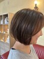 少し伸ばしかけの髪にニュアンスのパーマを。前上がりのマッシュルームベースにクセ付け程度のウェーブをつけて、洗いっぱなしでも可愛く仕上がるラクなスタイルです。