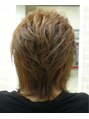 サイドを少し前下がりに長く残しトップにはボリュームが出るようレイヤーを入れてくびれのあるスタイルを作ります、カラーはイエローマット系立体感を出す為ハイライトを入れています