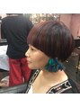 えり足スッキリのショートボブ。顔の形、首の長さ、えり足の生え方を踏まえて、絶妙な丸さを創る事で、短いスタイルの中にカワイさが生まれます。ハイライト&ローライト効果でフンワリとキリリを共存させ、様々な髪質、イメージに対応できる万能ヘア★