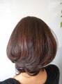 全体的にはシンプルな前下がりボブ。パーマであがるのを考え、えり足をきもち長めに設定。後ろを動かす事でかたくなりすぎないようにしました。カラーはピンク系を混ぜつや感が引き立つようにしました。
