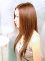 顔まわりを少し短いレイヤーカットで、軽すぎないスタイル。束感が残るようにスライドカットをし、まとまり感が出るようなスタイル。縮毛矯正だけれども、自然な感じに髪が流れるストレートにしています。