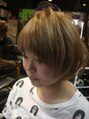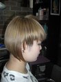 サイド、襟足を刈り上げて、正面はアシメなマッシュ系ボブに。バックは前下がりのグラデーションより少し角度をつけて作っています。ふわっとした丸みとシャープなラインがこのスタイルの特徴です。