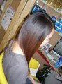 根元からの細かい縮毛で、アイロンとカラーの繰り返しでかなりのダメージがあり、特許のトリートメントを髪の中に入れながら矯正しました。