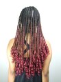 コンロウとブレイズのミックススタイル。毛先は最後まで編まずにカールをプラス。エクステンションはレッドのみでツートン風に。