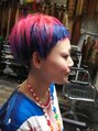 テクノカットで前髪ざっくり切り込んだスタイルですございます。カラーはピンクとブルーバイオレットで構成しています。