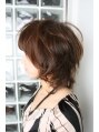 軽さと動きのあるスタイルで、トップからしっかりとレイヤーを入れ、毛先は、ワンカール。顔をつつみこむようなカールで輪郭が自然とシャープに見えます。