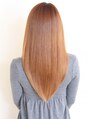 前髪を広めに作ったレイヤースタイル。重く見えないようにベージュ系のカラーリングがトーンアップしています。毛先がまっすぐになりすぎないように縮毛矯正を施術し、仕上げにハホニコトリートメントでツヤ感をUPしてます。
