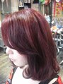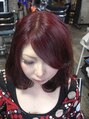 肩ラインより5cm長いミディアムにカットして、10レベルのレッド系のカラーに整え、ワインレドと深みのある紫を調合した色をON!そして、つやつやトリートメント♪内巻きに巻いて、はい!出来上がり♪