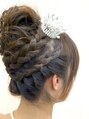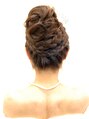 おだんごみたいにトップに集めたカールアップに編み込みをプラスしました。長さと毛量がある多めの方に向いている髪型です。