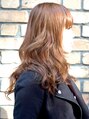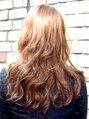 Aラインのロングレイヤーに厚めの前髪をラウンドにして、ルーズカールでナチョラルフェミニンにしあげました。ヌーディーカッパーのカラーにレッドオレンジのポイントカラーをプラスし艶を演出。