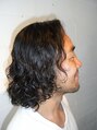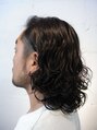 両サイドを刈り上げてツーブロックに。中間部から毛先にパーマをかけてワイルドに。