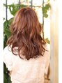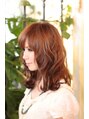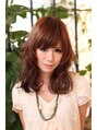 トップにレイヤーをいれて顔周りを軽くし前髪は、やや長めにおろし流します。中間毛先にふんわりカールを施しふんわりフェミニンなスタイルに似合わせカットで魅力アップ。