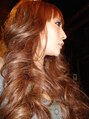 Aラインのロングスタイル。ウォームブラウン系のカラー☆エクステをつけ、よりロングに…。コテでふんわりしたカールを巻いて完成。