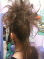 ワッフルのコテであとをつけてアニマル模様っぽくニュアンスを加えます。さらにルーズにアップしモヒカンスタイルに☆