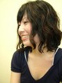 毛先半分を23ミリ縦巻きです大き目のロッドで巻いて毛先に軽さを出しますが広がりの気にならないパーマスタイルです
