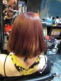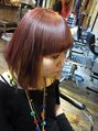 前下がりのベースをカットしてから、全体をブリーチします。上のセクションだけレッドブラウンをのせてカラーは終了。その後、ドライカットで微調整します。最後に前髪を重めにぱっつん、前髪の上の部分は斜めにカットします。
