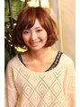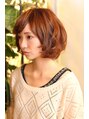 顔周りのリップラインカールで小顔に、全体のふんわりとしたカール感がキュートさをアピール。ナチュラルな柔らかい質感と斜めバングで更に可愛さをアップ。
