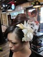 成人式の前撮り用でおセットしました。黒ベースのお着物だとお聞きしたので、散らさずにまとまったデザインにさせて頂きました。髪飾りはHIROの手作りです。
