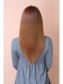 前髪を多めにとったレイヤースタイル。重いイメージにならないようにベージュ系のカラーをし、まっすぐになり過ぎないように毛先に丸みをつけながら縮毛矯正をかけました。ツヤ感を出すためにハホニコトリートメントで仕上げてあります。