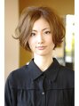 ちょこっとハネた毛先がポイントの前下がりのボブスタイル。長めの前髪が顔の輪郭をカバーしてくれるので小顔に見えやすい効果が!!ゆるめにかけたパーマが春にピッタリの軽やかなヘアスタイルです。