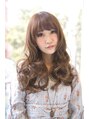 お人形のようなしっかりとした、大きめクルクルパーマでふわふわキュートな可愛らしいスタイルです☆甘く柔らかさを出した、スウィートフェミニンなスタイル♪透明感重視のカラーでメルヘンチックな雰囲気を演出♪