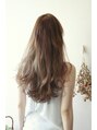 トップのみレイヤー+ストロークで柔らかい空気感を出したロンググラレイヤースタイル。大きめのロッドをランダムにmixして巻いたパーマと全体に細かく入れたハイトーンアッシュでナチュラルアンニュイを演出。