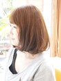 全体的に丸みのある柔らかなAラインシルエット、伸ばしかけの前髪も重めにして、内側に束間が出るようにカット。