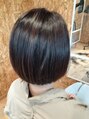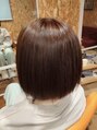 アゴのラインに設定したワンレングスボブ。サイドのラインをスクエアに設定し、丸みと動きが出るように、裾のほうに少しだけレイヤーを入れます。カラーはやや赤みのあるチョコレートブラウンを使用。縮毛矯正をハチ下部分にかけボリュームダウン。