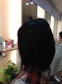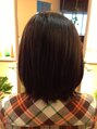 カジュアルメイン~オフィススタイルまでの似合わせと、長さを伸ばす事を考慮したボブベースのスタイル。次回来店までシルエットの収まりやすさが、長く持続するようカットしてあります。豊富な毛量を考慮してスソを少し削り、シルエットを引き締めました。