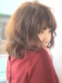 ふんわり柔らかなミディアムです!CUT/全体前上がりのラインでカット!トップのレイヤーは低めに設定しただ重いだけじゃない重さの中に動きをだしたスタイルです!CR/低明度ベージュで赤みを抑えました!