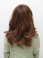 前上がりのローレイヤーベースで少し重めのカットベース。中間~毛先に大きなカールをあしらって仕上げたスタイル。