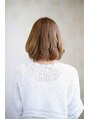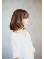 伸ばしかけの髪に毛先にワンカールをいれたSweetなボブ・スタイル。 重たく見えすぎないように、アッシュベージュで透明感のあるカラーリングを組み合わせています。