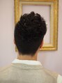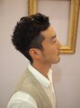 ベースはアシンメトリーのソフトモヒカン。ビシッと刈り上げることで男らしさを強調。パーマをランダムにかけデザイン性をアップさせると同時に大人っぽい雰囲気に!!
