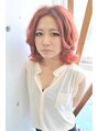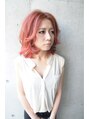 鎖骨ラインの、ボブベース。内側を毛量調整し、毛先中心に、外ハネ、スパイラルなど、ランダムに、パーマをかける。カラーは、9トーンの、アプリコットオレンジで。