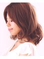 ミディアムヘアのワンレングススタイル。アッシュブラウンのカラーリングと中間から毛先にかけてのゆるめカールで、王道モテスタイル。