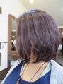 カラーで変化を付けたスタイル。全体は6トーンのレッドバイオレットブラウンで落ち着かせ、ハイトーン部分はツートンに出やすい色の濁りが出ないように14トーンのブラウンに少しバイオレットの入ったカラー♪