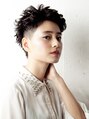 エッヂィな重めショートヘアです。サイドが刈り上げてあるマニッシュなスタイルです。くせ毛のような柔らかいパーマをかけています。シンプルに下ろしていると丸みのあるショートヘアに!
