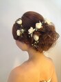 白いバラとカスミソウがキュートに散りばめられているのがポイントです。ウェディングヘアーにお勧め。華やかさの中に落ち着いた女性らしさも兼ね備えています♪