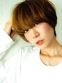 前上がりのマッシュショート。レイヤーにグラデーションを重ねて丸くカットし、目の上で流れるようにカット。カラーはベージュ系で柔らかく自然な透明感に。