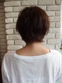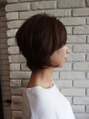 トップから後頭部にかけて、ボリューム感をもたせたショートスタイル。前下がりで知的に仕上げています。再現性の高いパーマをかけています。