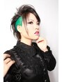 かりあげツーブロック部分のみブリーチをしてブルーのマニキュアをON。あえて他の部分はカラーをせずにブラックのままにします。基本のベースカットは前下がりボブですが、束感が出るように間引きのカットを入れます。