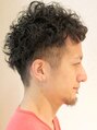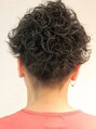 もみあげから襟足まですっきりかりあげて、かりあげはグラデーションにしていかつくなりすぎないようにする。カットは少し重みを残す。パーマはアウトラインやサイドに外はねを混ぜて巻いて、前髪はぺたっとおろしてピンカールで巻きます。