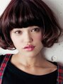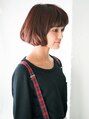 毛先にパーマをかけた可愛い前下がりボブスタイルです。ちょうどほほの部分に髪がかかるようになっているのでフェイスラインが綺麗にみえやすく、小顔効果が抜群です☆艶を出すためにセニングを使わず量をとり、艶やかなレッド系カラーをしています。