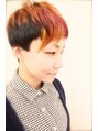モデルさんのクールな感じをいかしベリーショートにしました。エリ足は刈り上げ2ブロックにしフロント部分はマッシュにカットカラーはトップの部分をブリーチしパープルとイエローの2色のマニュキアを使い立体感を出しました。