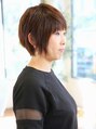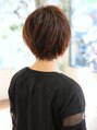 カラーはツヤ感のあるベージュブラウン。カットはトップの分け目をはっきりつけず無造作に仕上げたショートボブ。イメージはあまり作りすぎないナチュラルな感じ。パーマはなし。