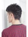 サイドから襟足にかけて刈上げでスッキリと。ウェットな質感と上げた前髪で大人の色気を出しました。