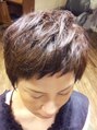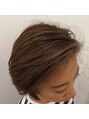 サイドから襟足にかけて内側を短く刈り込んでだツーブロックスタイル。パートのあたりに一本ハイライトを入れる。そうすることによって、パートの位置をずらすとハイライトの出方が変化して(見え隠れ)動きが出る。