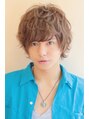 丸みのあるフォルムで甘さを、襟足などのハネの動きで男っぽさをアピールしたスタイル。ウエーブは外ハネ×内巻きのCカールパーマで柔らかさを表現。重めの前髪とトップがポイントです。