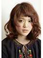 マユ上のバングとフェイスラインがポイント。Aラインのふわふわボブでキュートなイメージ。無造作な動きと外ハネでキュートさUP!