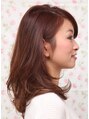 ツヤを感じる赤味のあるブラウンでカラー。毛先を軽く巻くことにより女性らしさを表現しました。